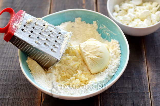 Кусок охлажденного сливочного масла натрите на крупной терке, постоянно обмакивая его в муку. Масло хорошо перемешайте с мукой.