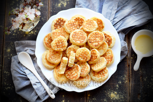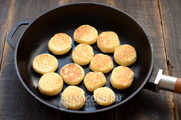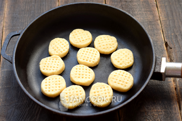 Жарьте творожное печенье на сковороде на небольшом огне до приобретения румяной поверхности с обеих сторон. Таким образом пожарьте все экземпляры.