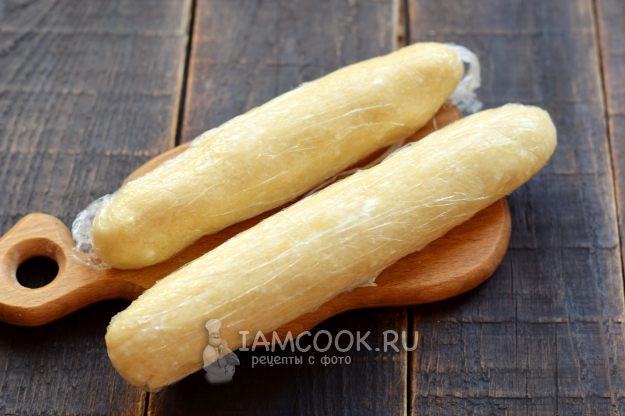 Тесто разделите на 2 части, из каждой скатайте рулеты среднего диаметра. Оберните их пищевой пленкой, загрузите в холодильник на 30-60 минут.