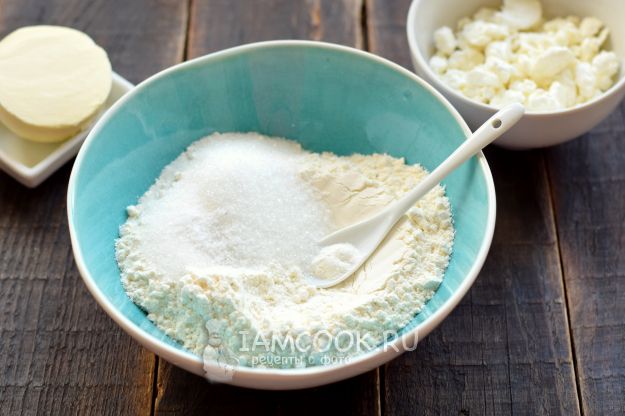 Муку просейте через сито, это избавит ее от возможного мусора, насытит кислородом. Параллельно муку соедините с пекарским разрыхлителем и сахаром, перемешайте, всыпьте щепотку соли.