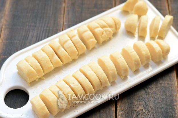 Спустя время достаньте тесто из холодильника, снимите пленку, нарежьте тесто на куски не толще 1 см, придайте им круглую плоскую форму. При желании можно сделать на заготовках узор – вилкой или кухонным молоточком.