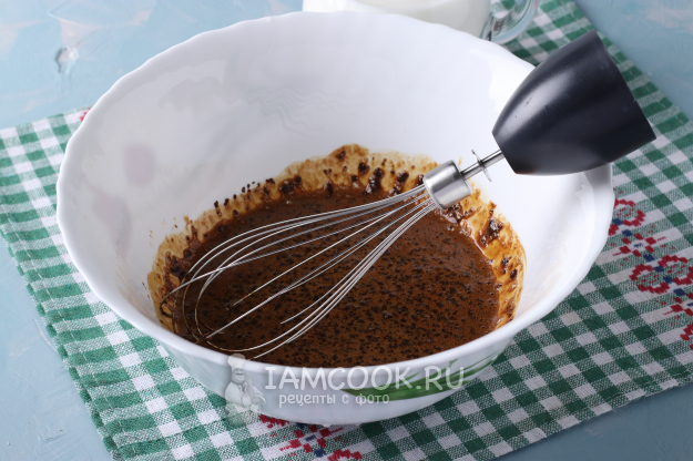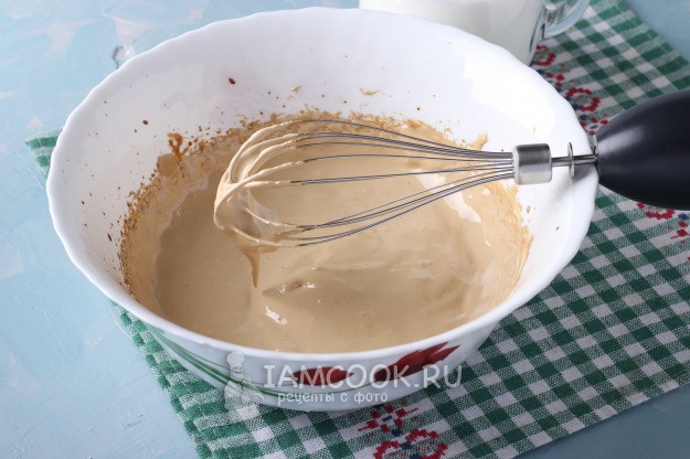 Взбивать кофейную массу, пока она не поменяет цвет на светлый и не увеличится в объёме до густой пышной пены. Консистенция должна быть похожа на мусс. Можно взбивать и вручную, но это займёт очень много времени - минут 15.