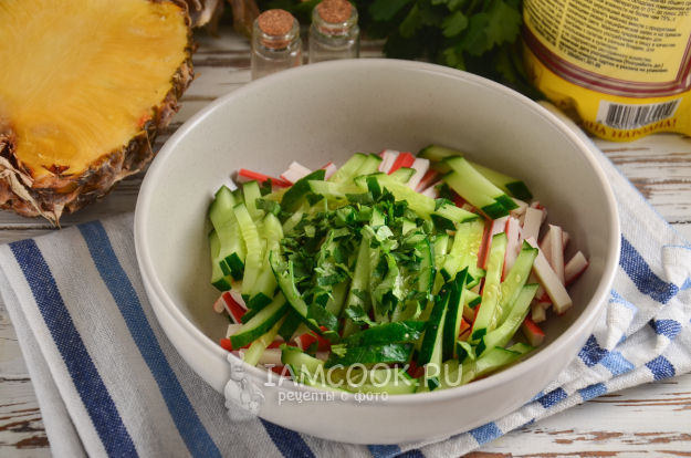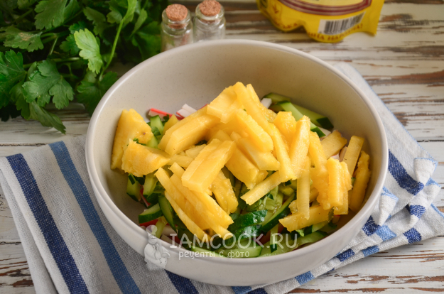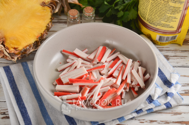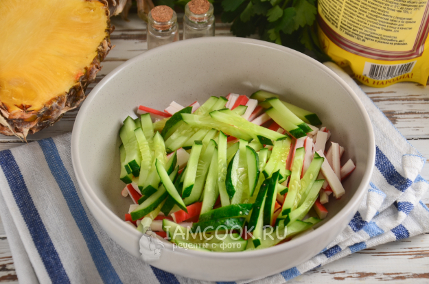 Мякоть свежего ананаса также нарежьте соломкой и положите в общую посуду.