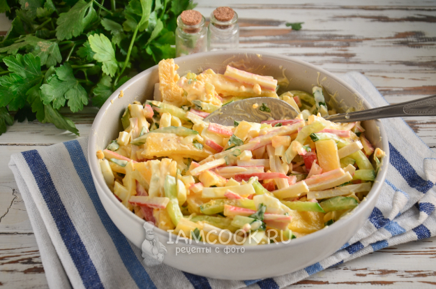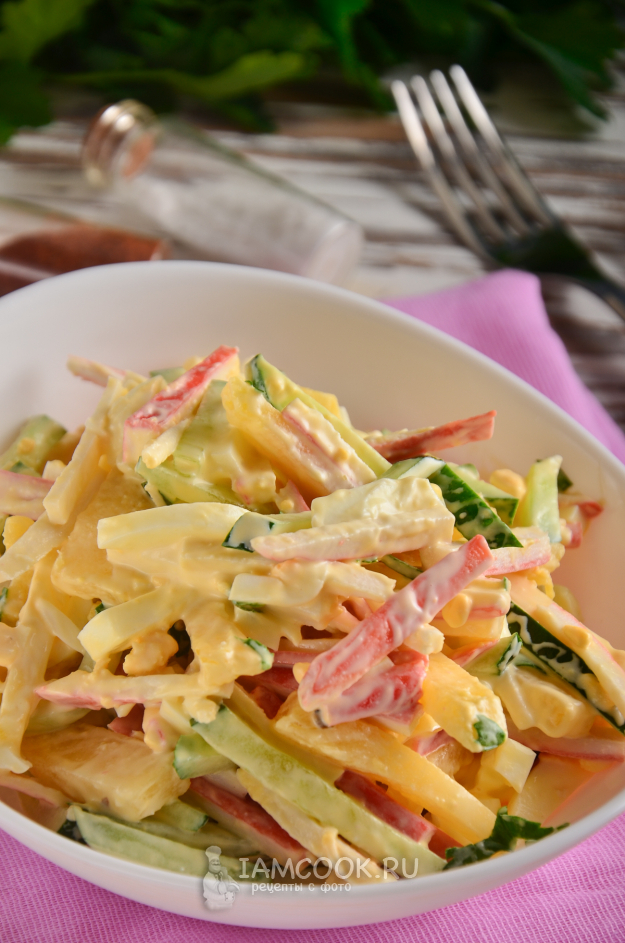 Вкусный салат с крабовыми палочками, свежим ананасом, яйцами и огурцом готов, и подавать его лучше сразу, в красивых небольших пиалах или общем салатнике.