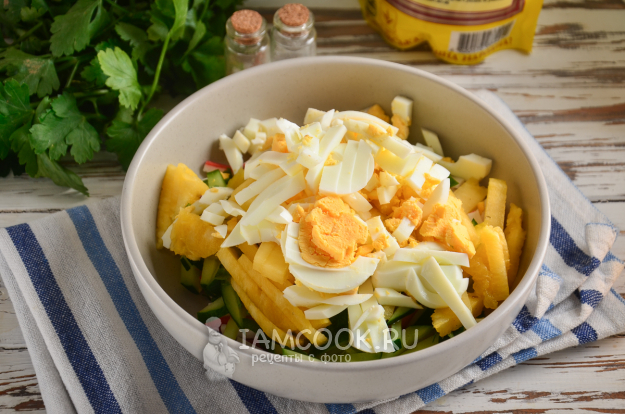 По аналогии с предыдущими продуктами, очищенные вареные яйца нарежьте тонкой соломкой и положите в салатник.