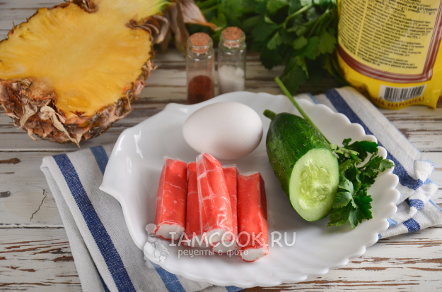 Подготовьте продукты для салата с крабовыми палочками, свежим ананасом, яйцами и огурцом. Палочки можно использовать замороженные или охлажденные. Куриные яйца заранее сварите в подсоленной воде вкрутую.