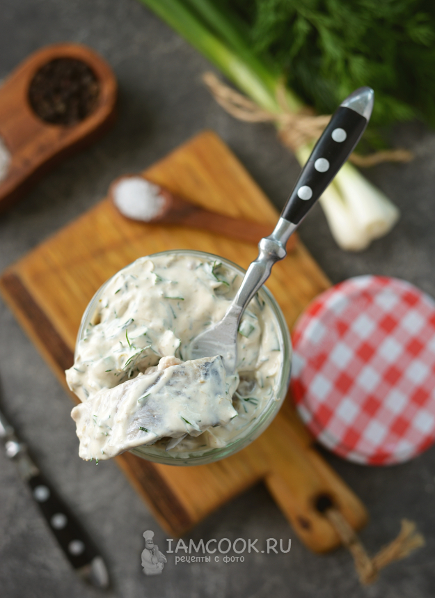 Ингредиенты для приготовления селедки в майонезе (майонезно-сметанном соусе) - перед вами. Лук и укроп помойте, обсушите.