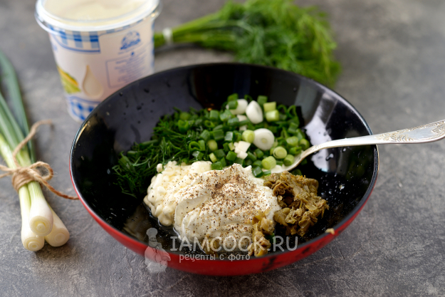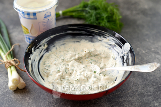 Сложите в глубокую миску майонез хорошего качества, сметану средней жирности, нарезанный зеленый лук, укроп, каперсы. Влейте лимонный сок, добавьте соль и перец по вкусу. Если лимон слишком кислый, тогда начните с одной столовой ложки, дальше - на свой вкус. Я еще добавляю щепоть сахара, но если не любите сладость в соусе, тогда не кладите его.