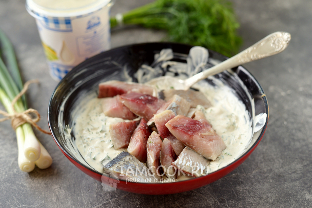 Выложите в соус нарезанную селедку, аккуратно перемешайте.