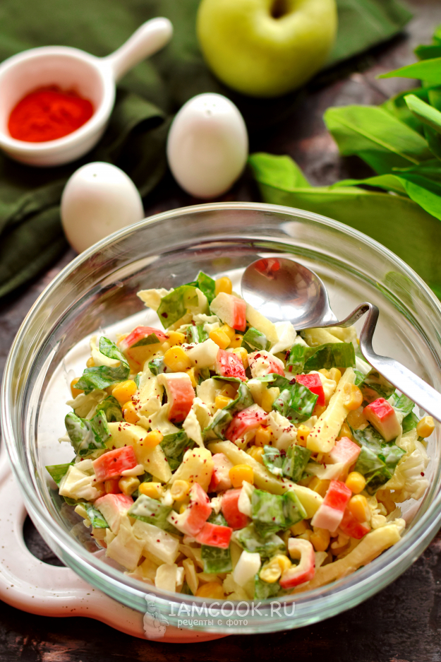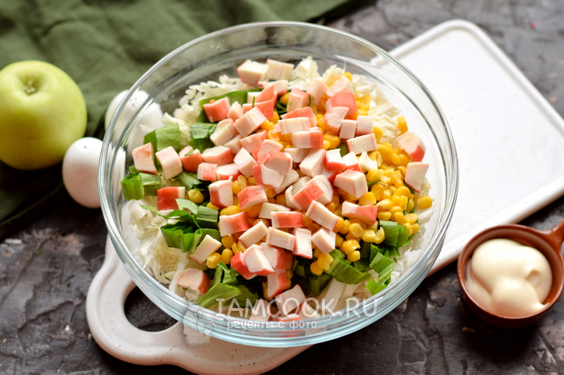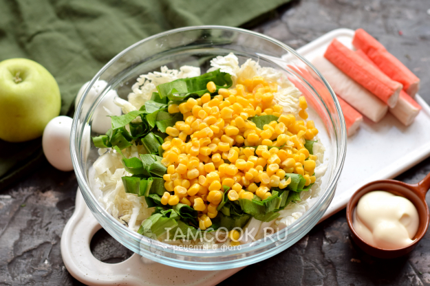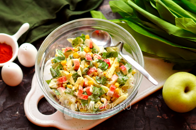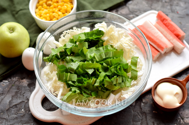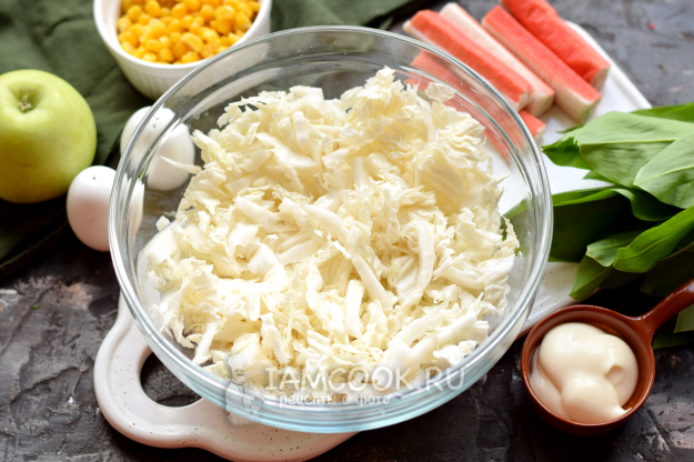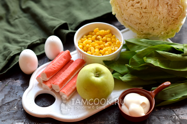 Подготовьте необходимые продукты для салата с крабовыми палочками, пекинской капустой, яблоком и черемшой.
