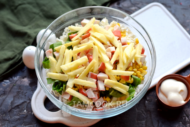 Крабовые палочки заранее достаньте из морозильного отсека, чтобы они разморозились, нашинкуйте их крупными кубиками.