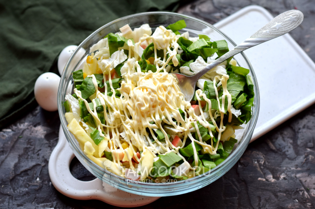 Смесь заправьте майонезом, посолите, тщательно перемешайте, чтобы майонез окутал каждый нарезанный элемент.