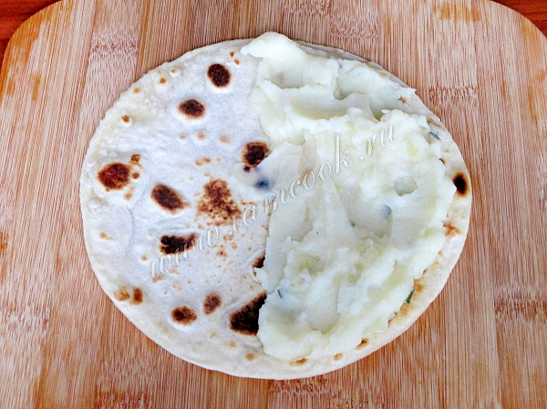 Пока лепешка горячая уложите на одну её половину начинку и сложите пополам. Смажьте сливочным маслом.