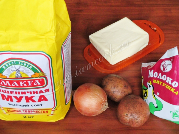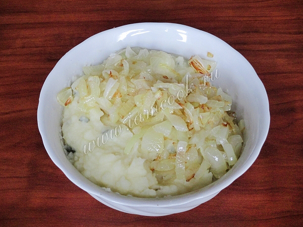 Первым делом приготовьте начинку: сварите картофель, разомните его в пюре, добавьте горячее молоко, специи, соль, перемешайте и затем соедините с жареным луком.