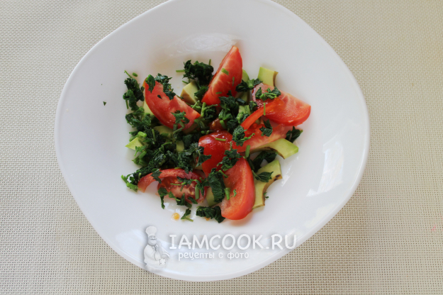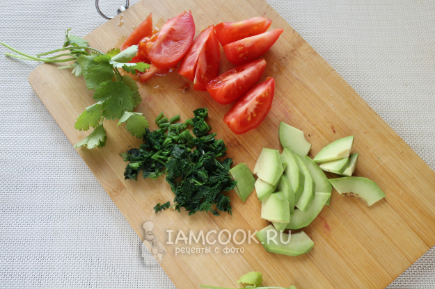 Помидор порежьте ломтиками, плотный авокадо тоже нарежьте тонкими кусочками, отжатую от воды крапиву измельчите. Добавьте для аромата несколько веточек кинзы.