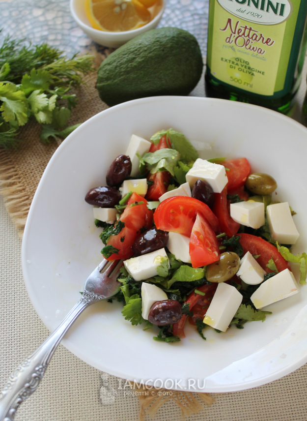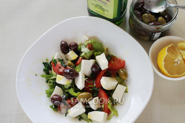 Заправьте салат лимонным соком и оливковым маслом. Соль я не беру - ее достаточно в используемых продуктах.
