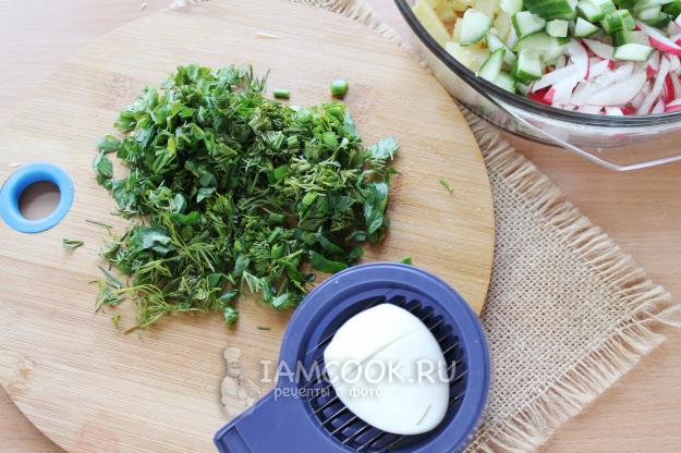 Измельчите много зелени и вареные яйца.