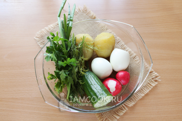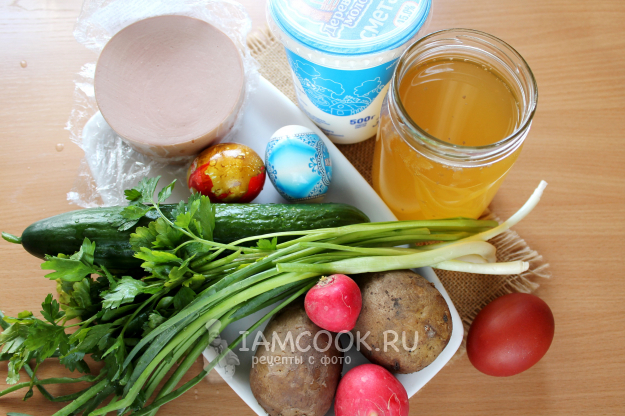 Возьмите продукты для окрошки на квасе из березового сока с колбасой.