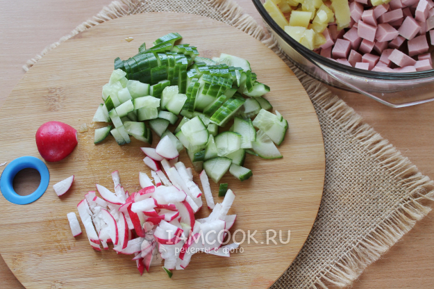Следом нарежьте огурец и редис.