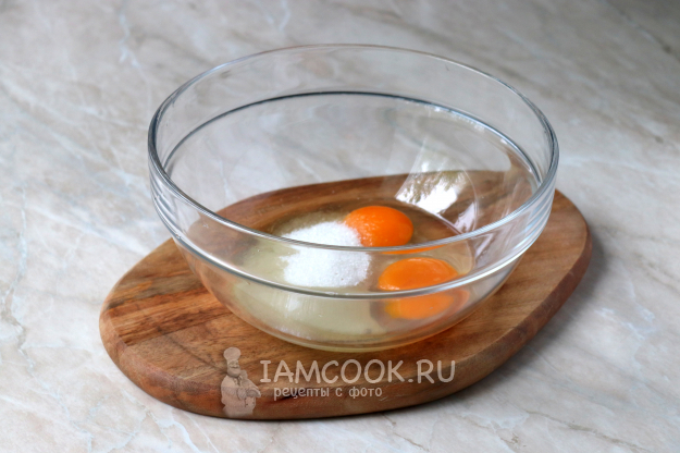 Куриные яйца соединяем с сахарным песком в глубокой миске.