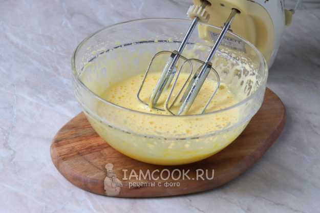 С помощью миксера взбиваем массу до однородного светлого состояния. Взбивать нужно до тех пор, пока сладкие кристаллы не растворятся.