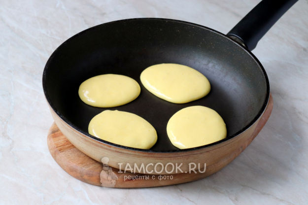 Выложим тесто на разогретую сковороду небольшими порциями, сохраняя небольшую дистанцию между ними. Оладьи пекутся на сухой сковороде, поэтому она должна быть с хорошим антипригарным покрытием.