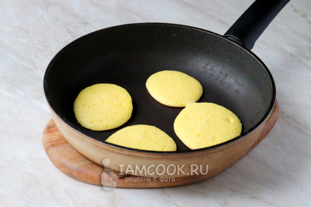 Накроем сковороду крышкой и сделаем минимальный нагрев. Выпекаются бисквитные оладьи только с одной стороны, около 2-3 минут, пока их поверхность полностью не схватится (то есть не останется мокрых участков). Теперь самое интересное: оладьи нельзя сразу снимать, потому что у них нежнейшая структура. Поэтому снимаем сковороду с огня, убираем крышку и даём лепёшкам немного остыть. Только после этого, очень аккуратно, с помощью деревянной лопатки перекладываем выпечку на плоскую тарелку.