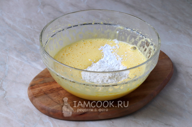 После чего введём просеянную пшеничную муку и немного разрыхлителя.