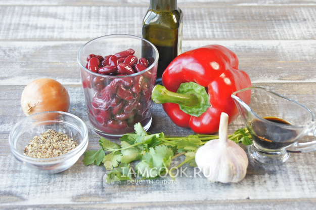Подготовьте все необходимые продукты для приготовления салата «Лобио» с красной фасолью.