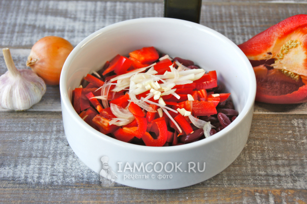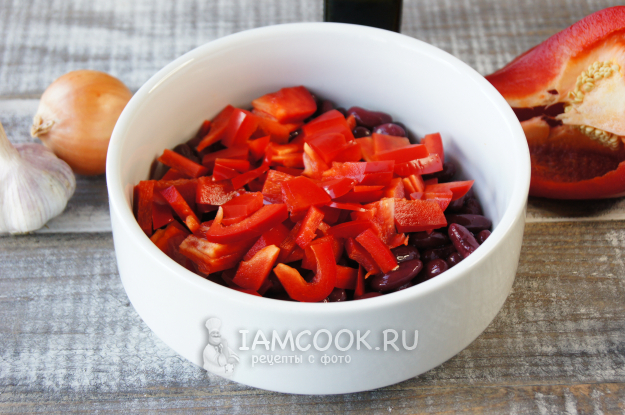 Из консервированной фасоли слейте жидкость и выложите в салатник.