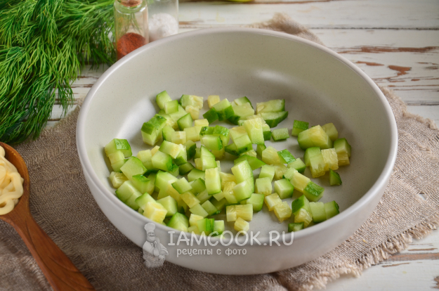 Для нарезки салата возьмите подходящую посуду. Огурец нарежьте небольшими кубиками и положите в салатник.