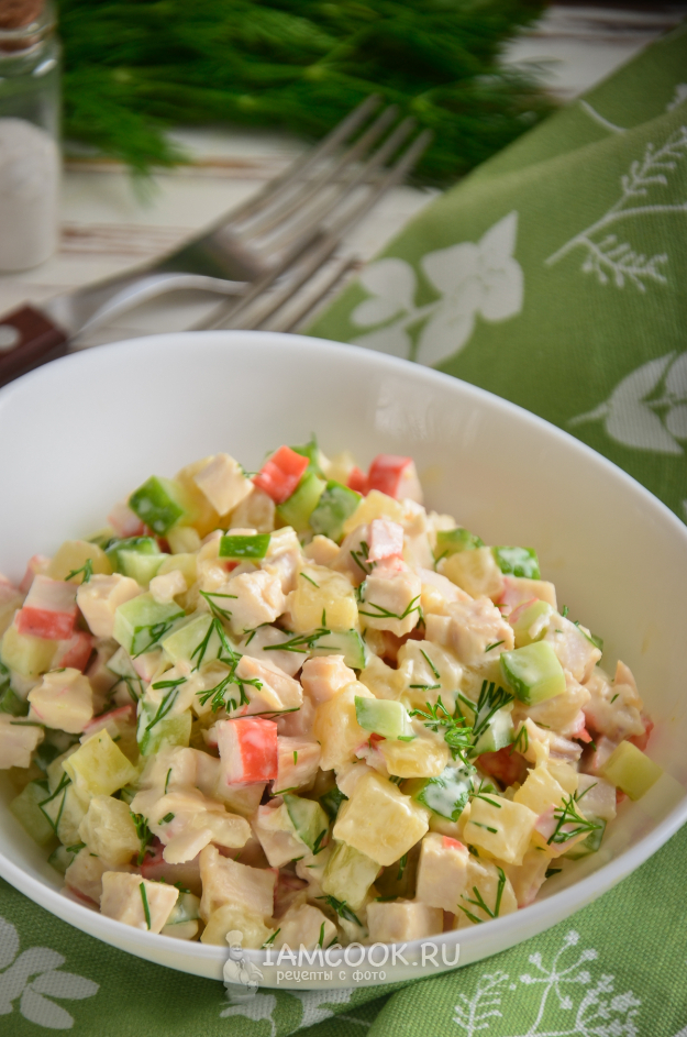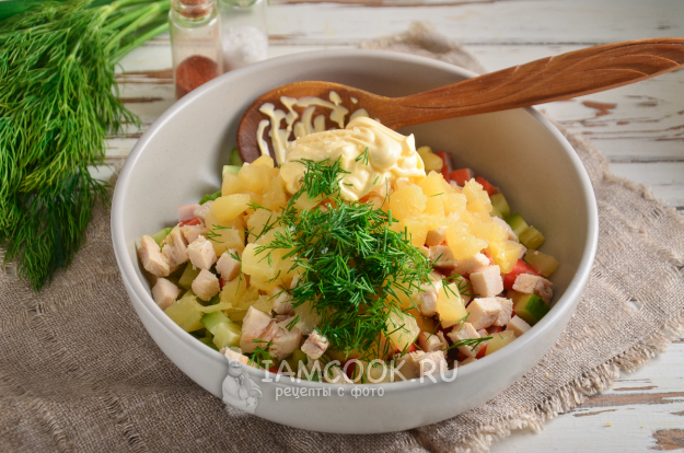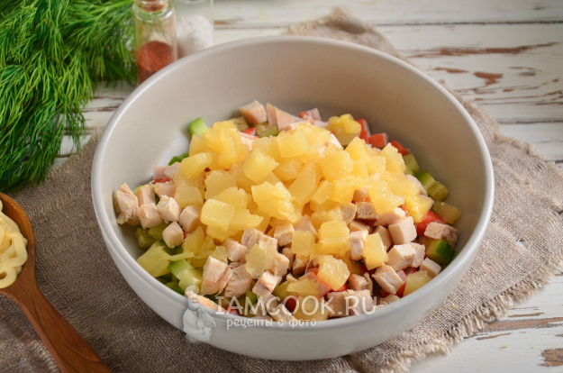 Кусочки консервированного ананаса нарежьте небольшими кубиками и отправьте в салатник.