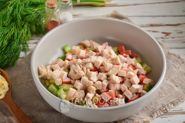 Вареное куриное мясо нарежьте небольшими кусочками и положите в миску к остальным продуктам. Также можно разобрать курицу на волокна.