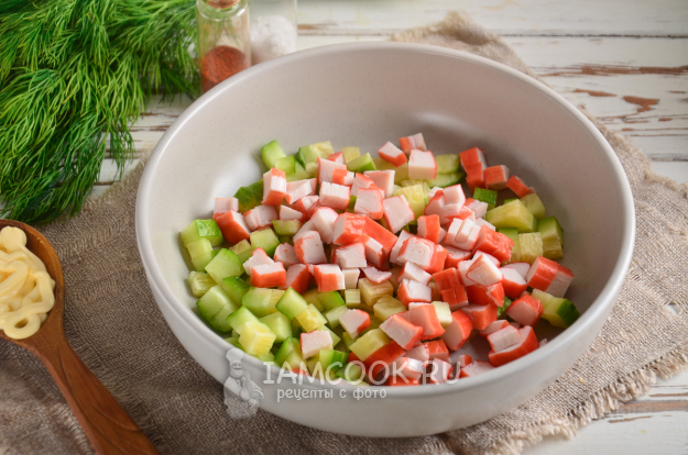Очищенные от целлофана палочки нарежьте небольшими кусочками и положите в салатник.