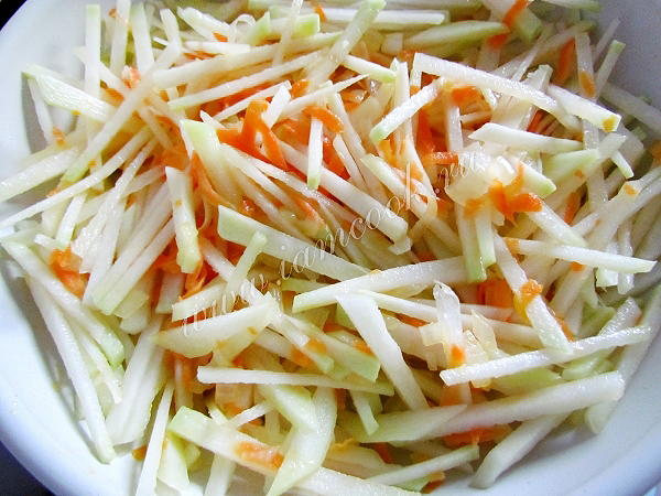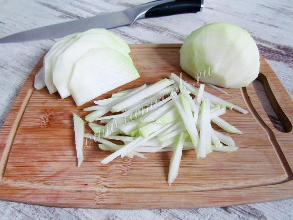 Капусту очистите от стеблей, листьев и кожуры. Разрежьте пополам, а затем вдоль на тонкие пластины. Нашинкуйте капустные пластины тонкой соломкой.