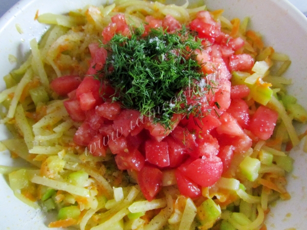 Затем добавьте помидоры и зелень. Посолите и поперчите по вкусу. Всыпьте щепотку сахара.