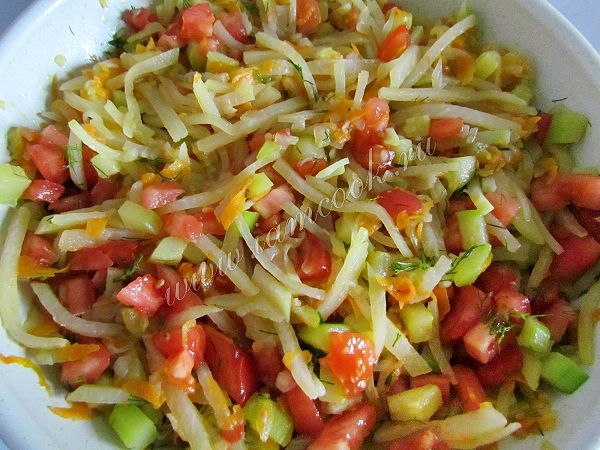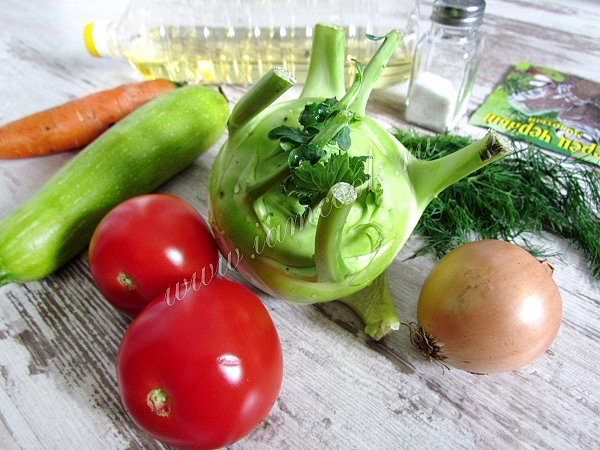 Кольраби - разновидность белокочанной капусты и ценный диетический овощ, который богат витаминами, особенно витамином С, и микроэлементами. По вкусу кольраби напоминает кочерыжку белокочанной капусты, только нежнее и слаще её. Сегодня предлагаю рецепт кольраби, тушеной с луком, морковью, кабачком и помидорами. Это вкусное и полезное блюдо можно подать как гарнир к мясным блюдам, либо как самостоятельное блюдо.