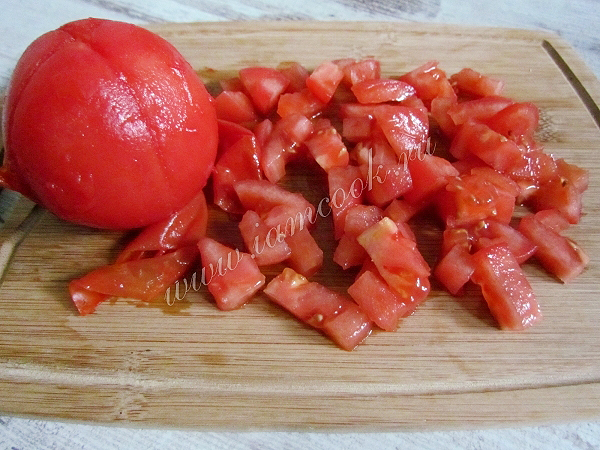 Помидоры крестообразно надрежьте, опустите в кипяток на 1 минуту, затем слейте воду и удалите кожицу. Нарежьте помидорную мякоть небольшими кусочками.