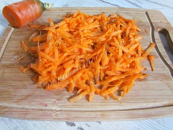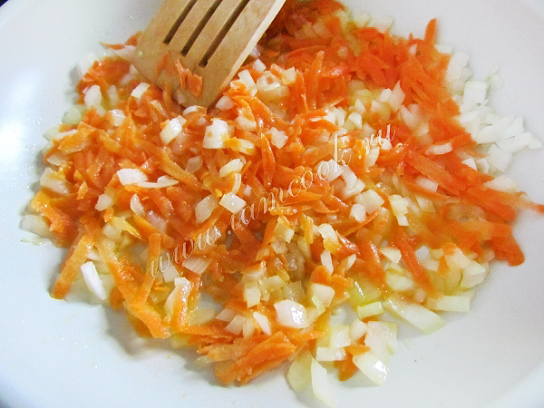 Разогрейте на сковороде или в сотейнике растительное масло. На среднем огне обжарьте до мягкости лук и морковь.