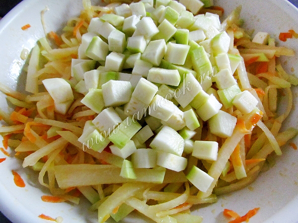Добавьте капусту, перемешайте с луком и морковью, накройте крышкой и тушите на небольшом огне до полу-готовности.