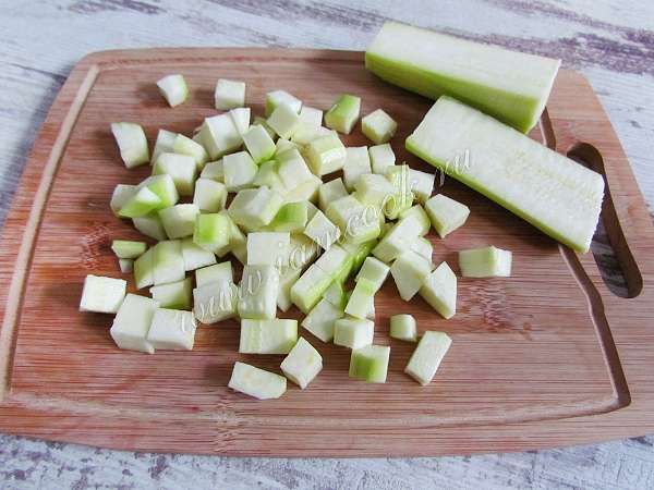 Добавьте нарезанный кабачок, перемешайте и тушите еще 10 минут под крышкой.