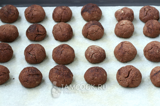 Застелить противень пергаментом, разложить на нём заготовки печенья и отправить в духовку, разогретую до 180 градусов.