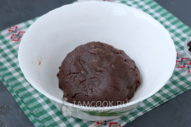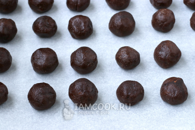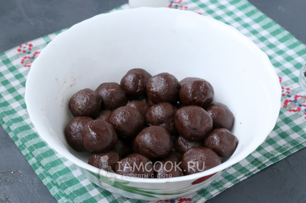 От теста отщипывать кусочки теста размером с грецкий орех, несколько раз сжать тесто в ладони, затем скатать шарик. Таким образом скатать шарики из всего теста.