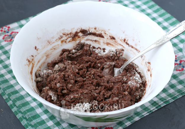 Когда ложкой размешивать станет неудобно, продолжить замес теста руками. Тесто получится довольно влажное и жирное.