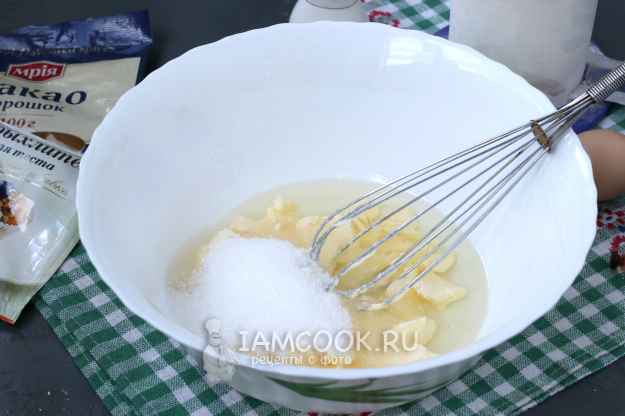 В глубокой миске смешать с помощью венчика мягкое сливочное масло с сахаром и растительным рафинированным маслом.