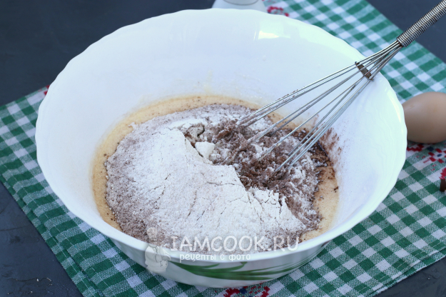 Капнуть в эту массу пару капель ванильной эссенции, просеять половину муки вместе с какао и разрыхлителем. Добавить соль.