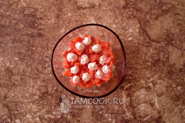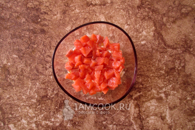Красную рыбу нарежьте кубиком - это второй слой.