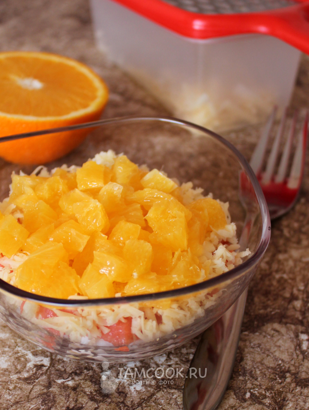 Сверху уложите на салат апельсин, нарезанный кубиком.