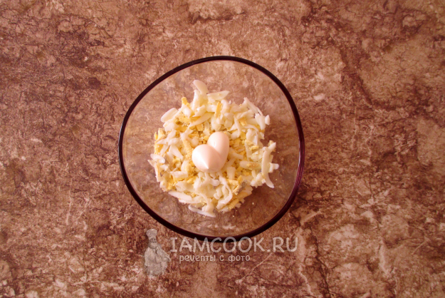 Первый слой салата - тертые яйца. Добавьте к ним майонез по своему вкусу...
