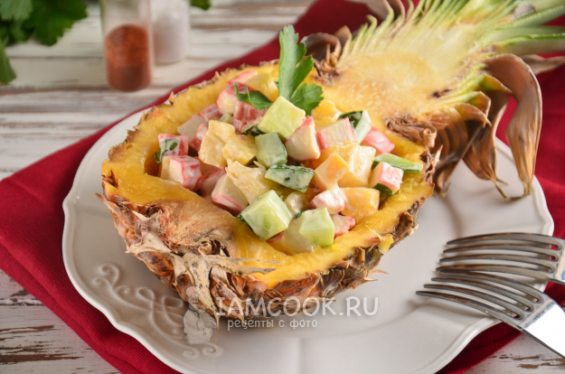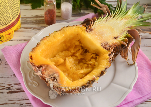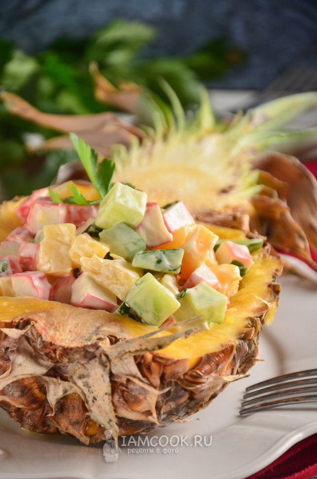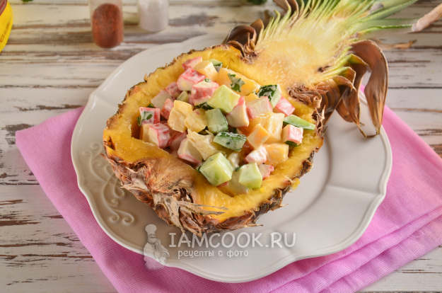 Перемешайте все ингредиенты, попробуйте салат. Если все устраивает, положите порцию в половинку ананаса. Подавать лучше сразу после заправки.